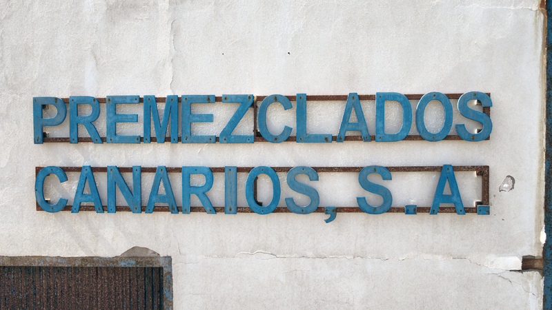 <p>R&oacute;tulo de la empresa <em>Premezclados Canarios,</em>&nbsp;formado por letras recortadas en chapa met&aacute;lica, atornilladas individualmente a dos largueros horizontales de hierro. El cromatismo azul intenso contrasta con el fondo claro del paramento, favoreciendo la visibilidad a distancia. La tipograf&iacute;a, de palo seco y trazo contundente, es propia del lenguaje gr&aacute;fico industrial de las d&eacute;cadas finales del siglo XX. Constituye un vestigio f&iacute;sico de esa etapa industrial, vinculado a la memoria econ&oacute;mica del entorno de Pozo Izquierdo y a la expansi&oacute;n constructiva de finales del siglo pasado en Canarias.</p>