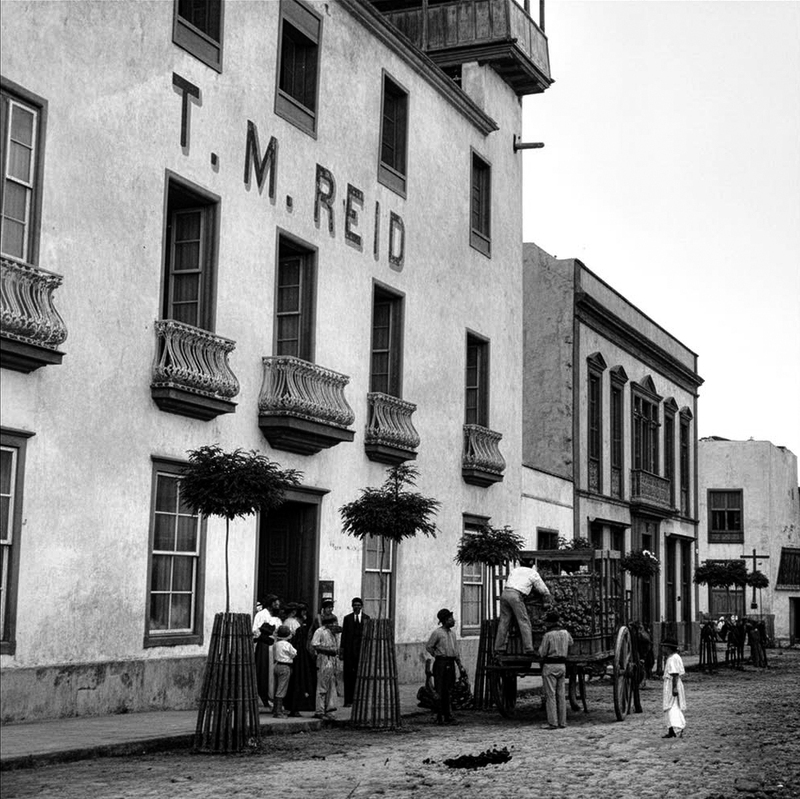 Rótulo histórico identificado en la fachada de un edificio comercial, correspondiente a la firma <em>T. M. Reid</em>, casa mercantil británica establecida en Tenerife a finales del siglo XIX y activa durante las primeras décadas del siglo XX. Fue una de las empresas más importantes del Puerto de la Cruz en el tránsito entre el siglo XIX y comienzos del XX, operando como centro de importación y exportación de mercancías diversas —incluyendo ultramarinos, provisiones, material agrícola, abonos, semillas, cementos, pinturas, materiales de construcción— y actuando como agencia de buques, agente bancario y de seguros en un periodo clave del desarrollo económico local.