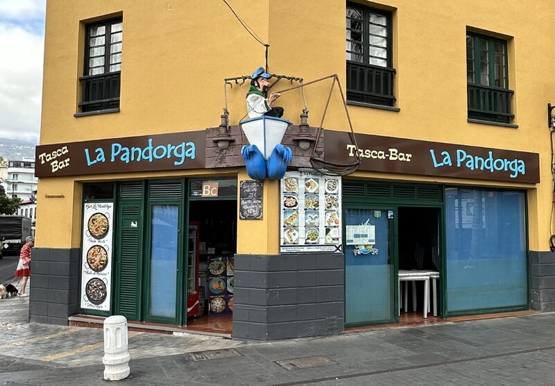El rótulo de La Fragata mantiene una composición tipográfica acorde con su carácter clásico y marítimo. El restaurante ha sido durante décadas un punto de encuentro social para vecinos y turistas, testigo vivo del desarrollo del turismo en la ciudad, un establecimiento emblemático junto al muelle de Puerto de la Cruz, abierto en 1972 y aún en funcionamiento. Su longevidad lo convierte en uno de los locales con mayor continuidad y actividad del centro portuense. El conjunto transmite estabilidad, identidad marinera y apego al entorno, con ecos del diseño clásico de bares de puerto: sobriedad, materiales nobles, contraste de texturas (piedra, madera, hierro), y rotulación de impronta artesanal.