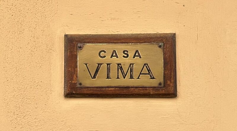 Curioso rótulo en un remate curvo sobre la entrada del edificio, con tipografía de palo seco, ligeramente condensada y con remates suaves en los vértices de algunas letras, pintada en rojo El diseño y los acabados arquitectónicos permitirían situarlo, con reservas, en torno a mediados del siglo XX.
