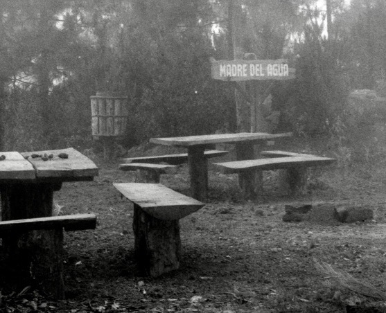 Cartel de madera con la inscripción “Madre del Agua”, ubicado en una zona recreativa forestal en el entorno del Puerto de la Cruz o La Orotava. El cartel señalizaba un área de descanso equipada con mobiliario rústico, utilizada para actividades recreativas y educativas en la década de 1970. Durante las décadas de 1960 y 1970, se desarrollaron en Tenerife diversas zonas recreativas en entornos forestales, equipadas con mobiliario rústico que eran utilizadas para actividades de esparcimiento, educación ambiental y recreación familiar.