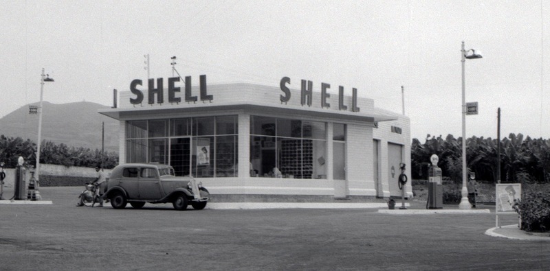 <!-- wp:paragraph {"className":""} --><p>Despliegue gráfico muy cuidado en la gasolinera Shell integrada en el muro de un talud a la salida del Puerto de la Cruz: rótulo horizontal de coronación, logotipo volumétrico en relieve sobre panel inclinado y el icónico cartel luminoso en poste con la concha corporativa. El lenguaje gráfico de la estación se articulaba en tres planos claramente jerarquizados: Rótulo principal, con letras negras de trazo moderno sobre fondo blanco, ubicado sobre la marquesina frontal, logotipo en relieve de la concha Shell, montado sobre un panel trapezoidal inclinado pintado en rojo corporativo, que actuaba como reclamo lateral y elemento de identidad visual y cartel elevado en poste, con caja de luz que contenía el emblema clásico de la concha (blanca sobre fondo rojo), visible desde la carretera para tráfico ascendente y descendente. Este sistema tripartito de señalización responde al modelo visual estándar que Shell implementó en estaciones de servicio urbanas y rurales por todo el mundo desde los años 50, pero su adaptación a una estación mural la convierte en un caso singular dentro del territorio insular.</p><!-- /wp:paragraph --><!-- wp:paragraph --><p>La estación funcionó en los años 60 como punto de repostaje en el corredor interurbano TF-5, justo en la curva que sube desde el centro del Puerto de la Cruz hacia el Mirador de La Paz. Su integración en la pendiente se resolvía mediante una solución de estación mural, donde el edificio quedaba encastrado en el muro de contención.</p><!-- /wp:paragraph -->